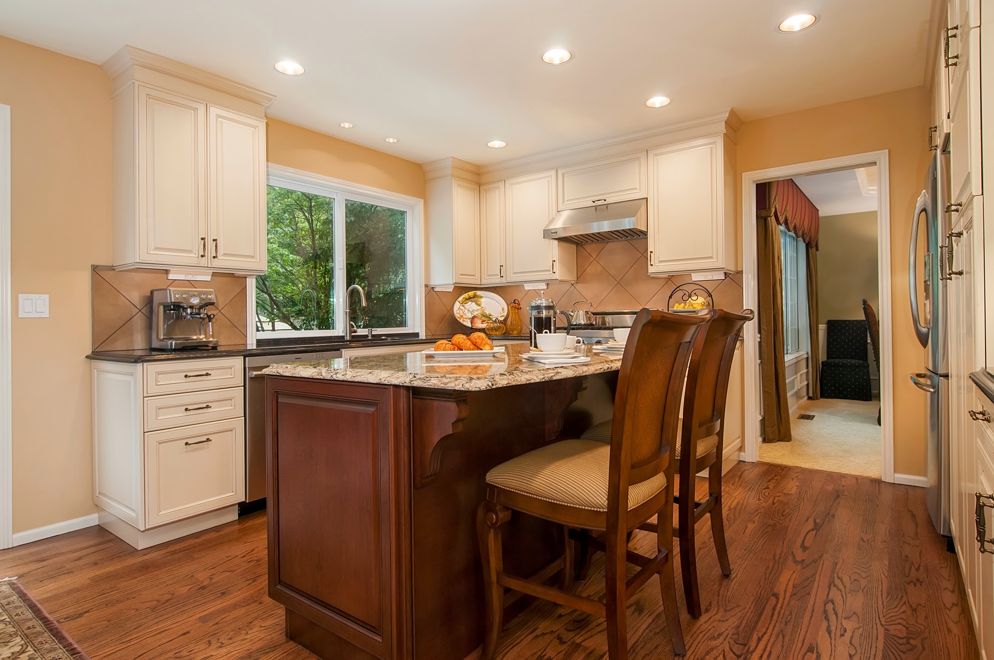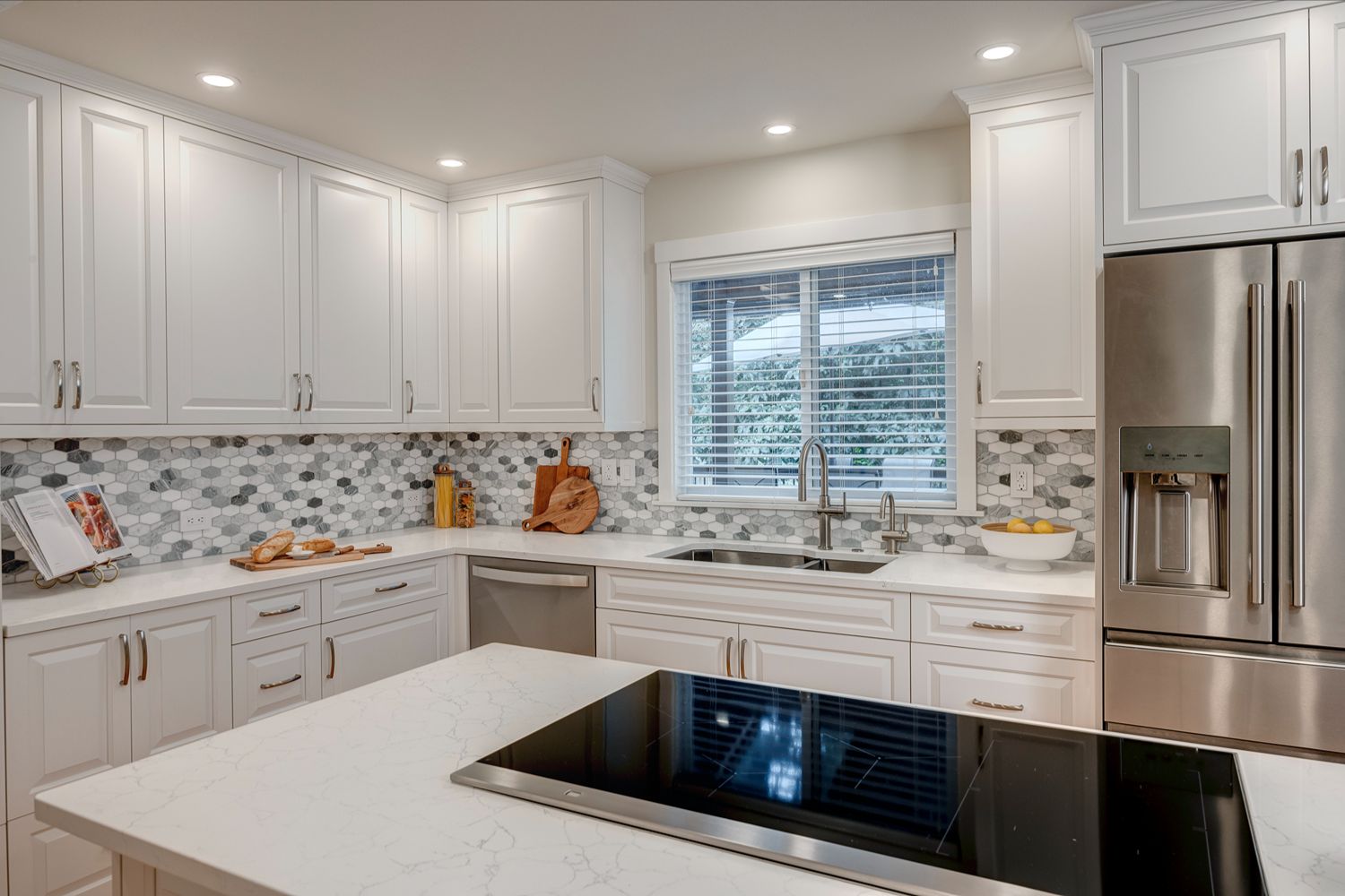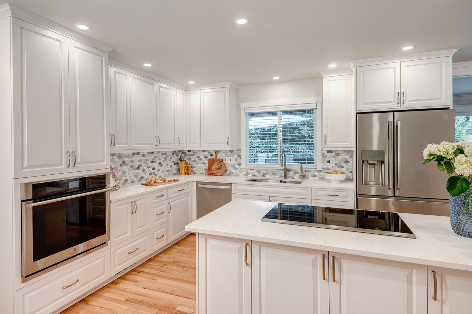 sophisticated look. Thoughtfully designed with ample storage, expansive countertops, and a central island featuring an induction cooktop, this space is built for both beauty and efficiency. Natural light floods the room through a large window over the double sink, while recessed lighting and warm wood flooring complete the bright, inviting atmosphere.