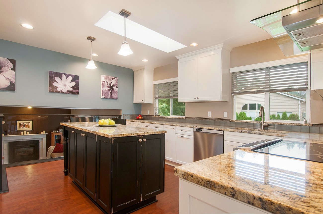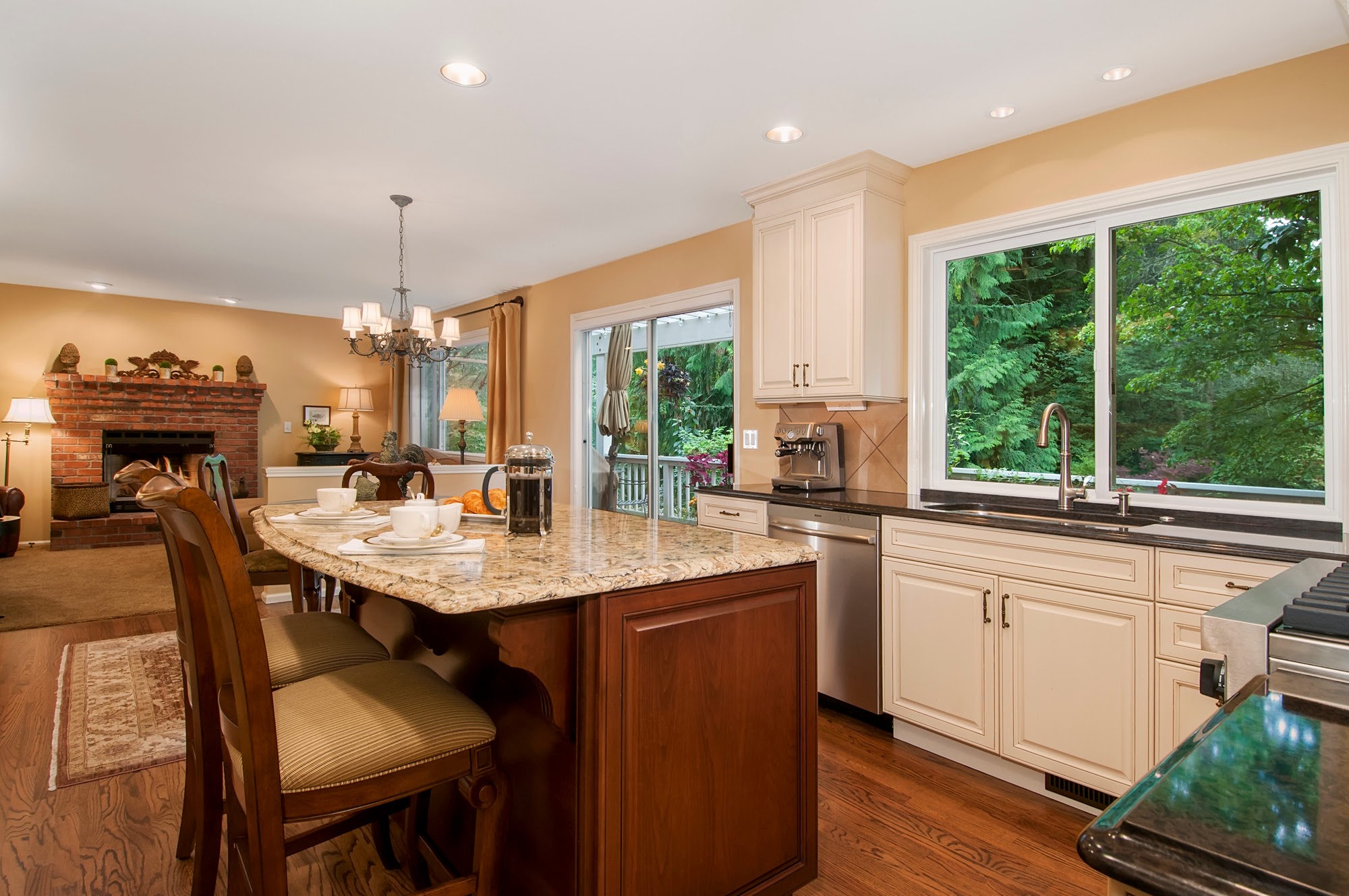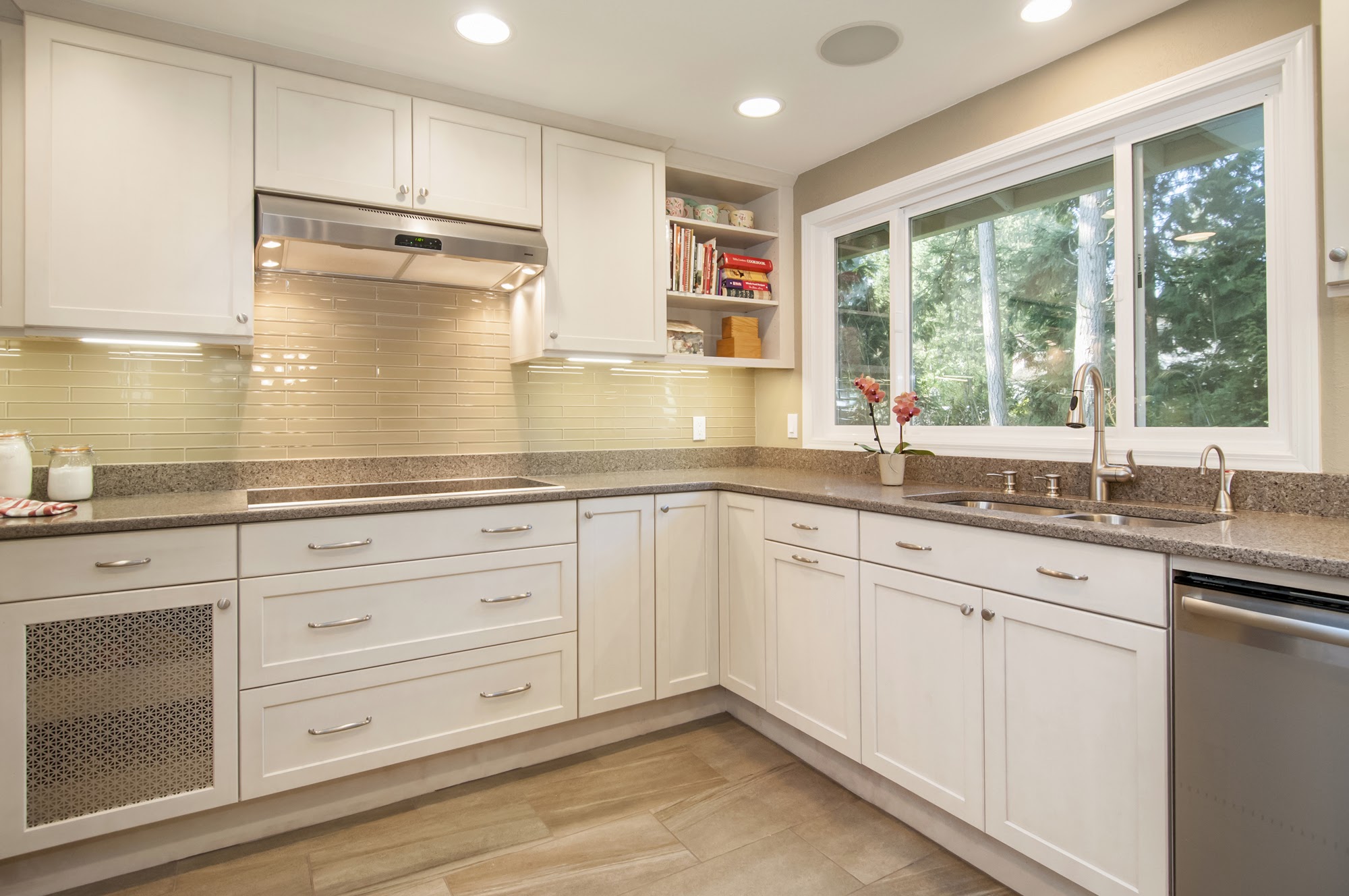 sophisticated look. Thoughtfully designed with ample storage, expansive countertops, and a central island featuring an induction cooktop, this space is built for both beauty and efficiency. Natural light floods the room through a large window over the double sink, while recessed lighting and warm wood flooring complete the bright, inviting atmosphere.