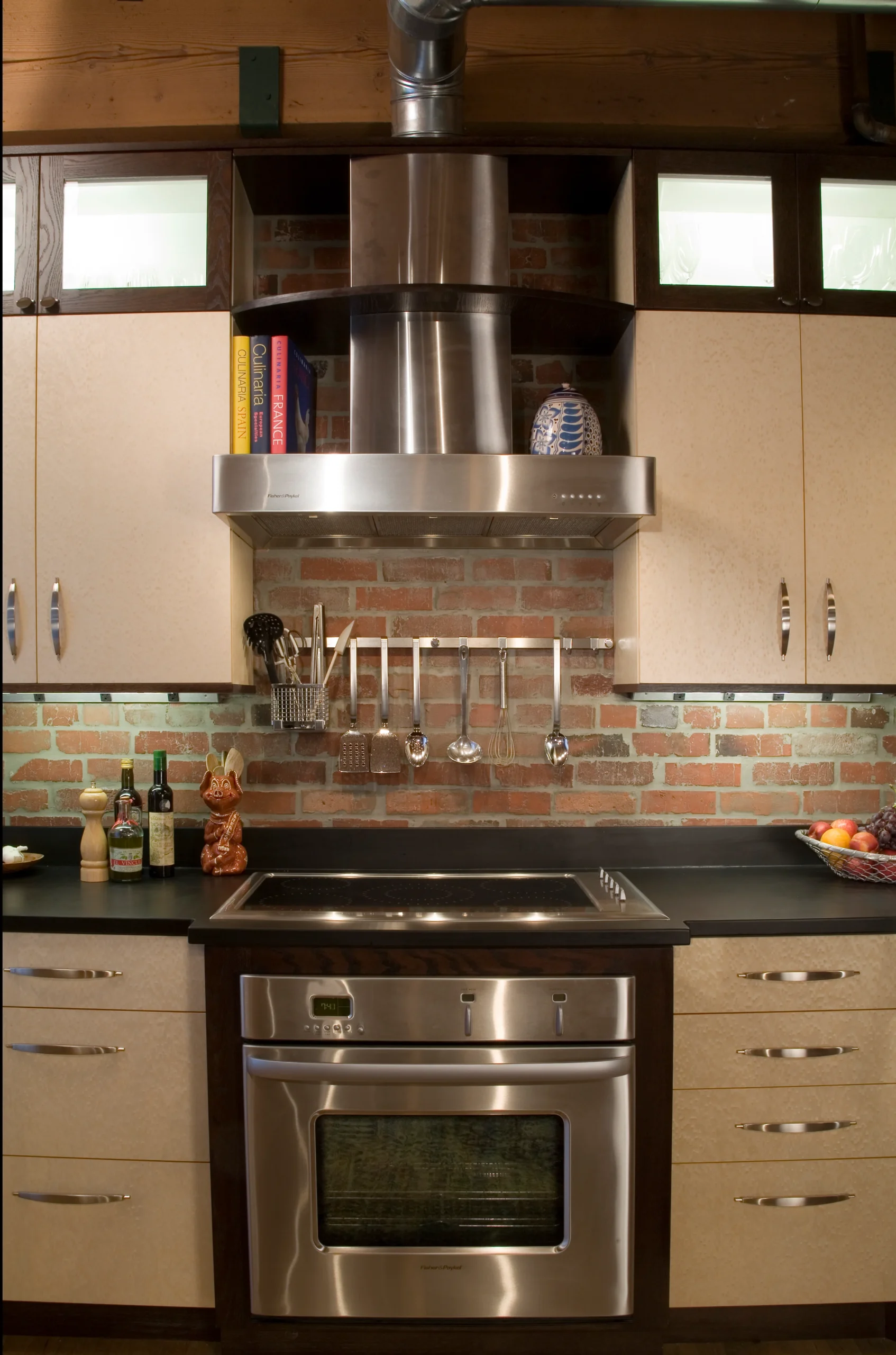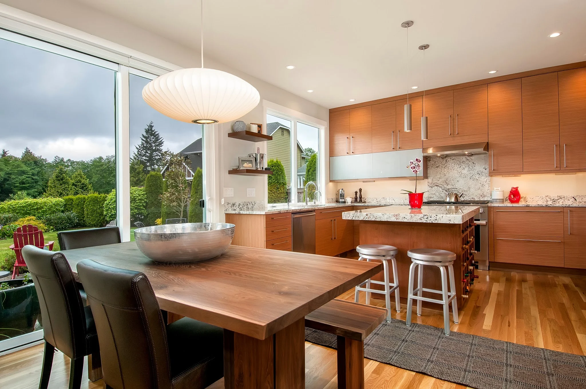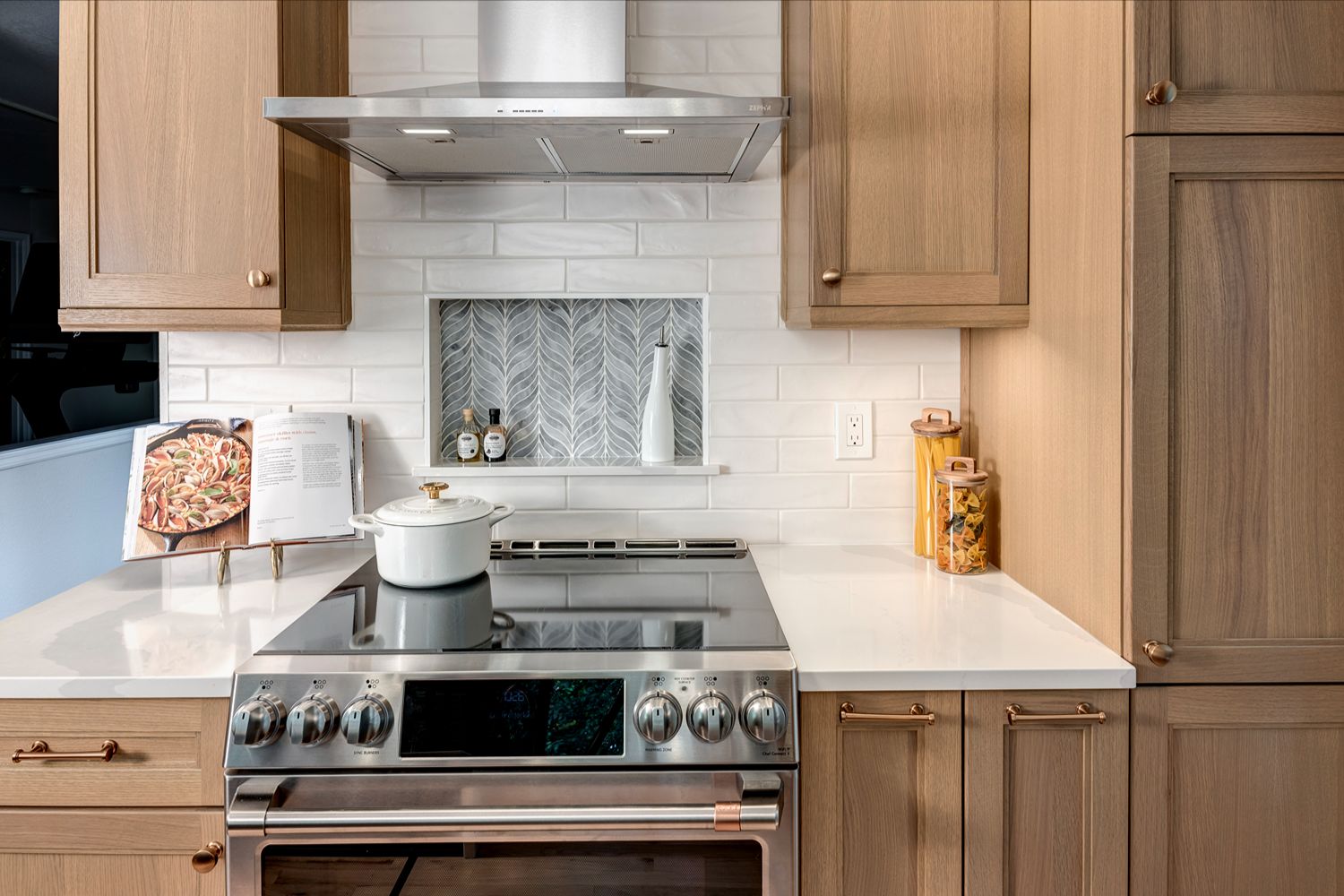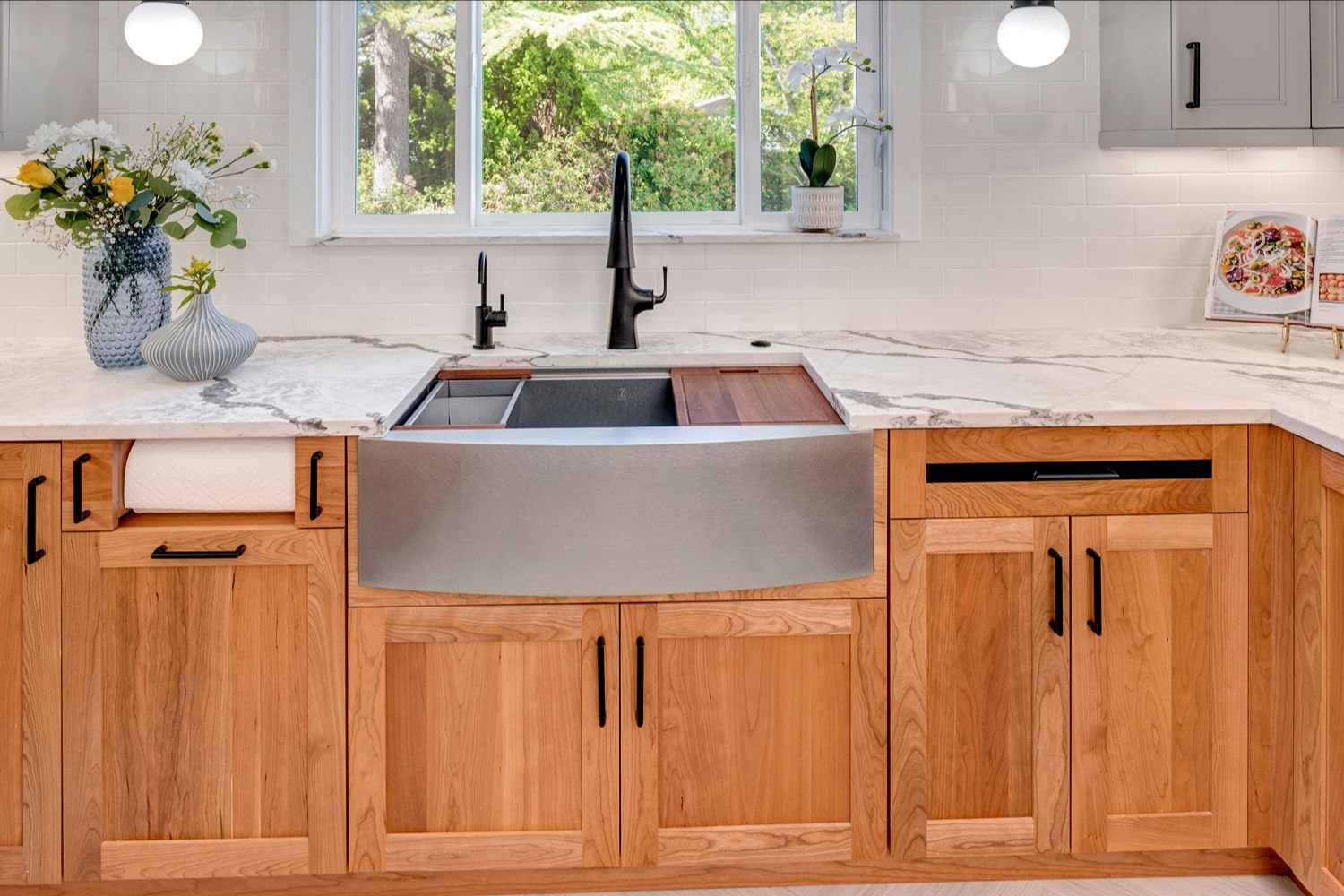 This kitchen blends warmth and sophistication with a striking mix of natural