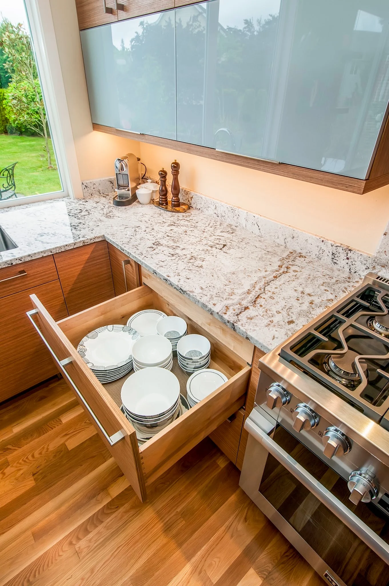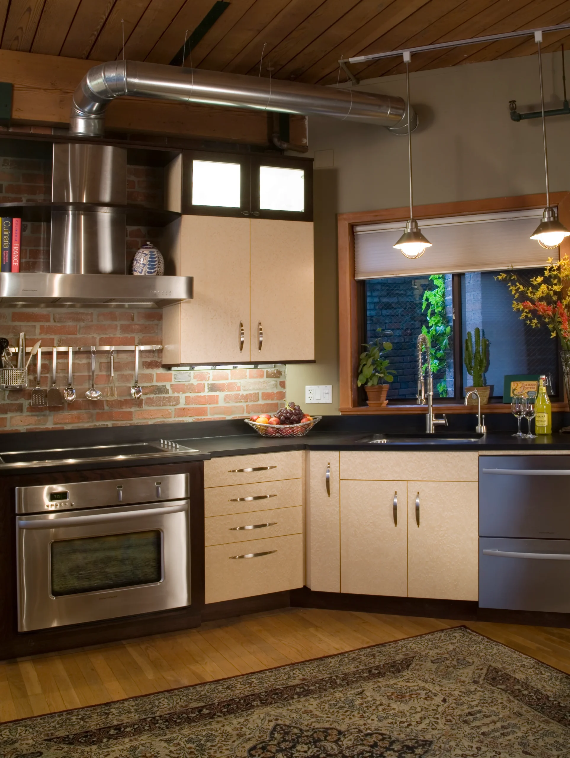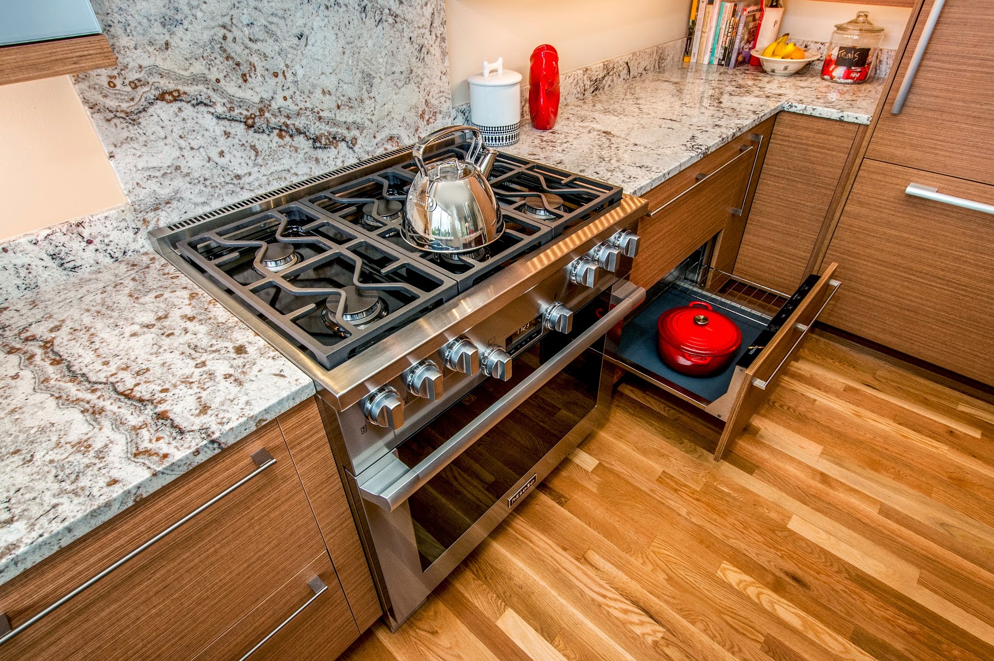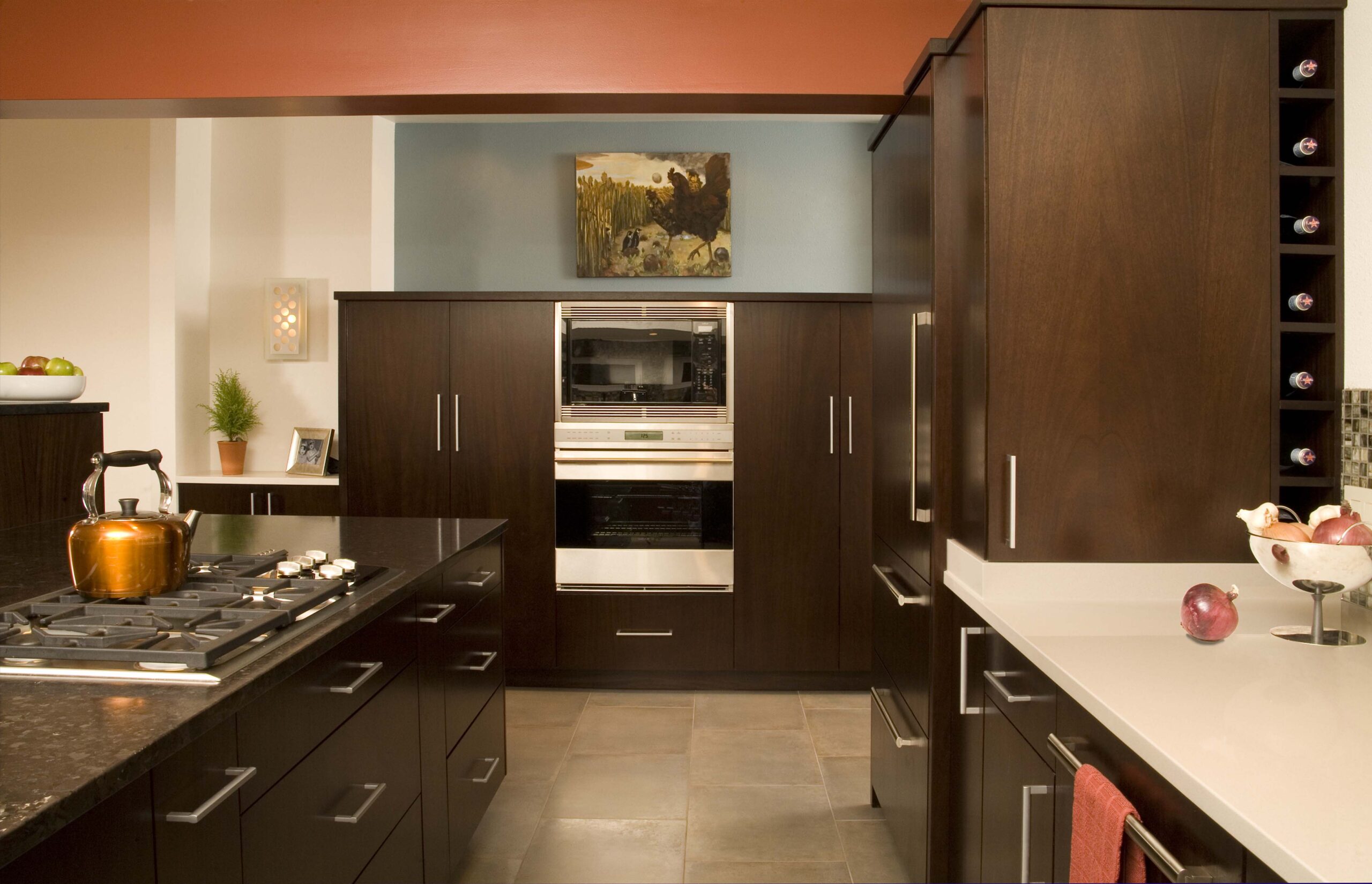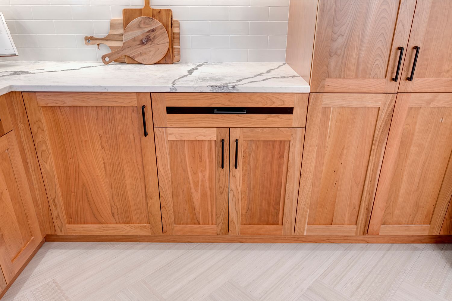 This kitchen blends warmth and sophistication with a striking mix of natural