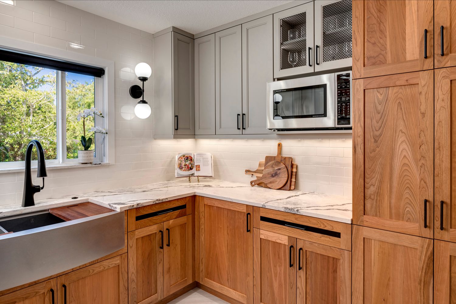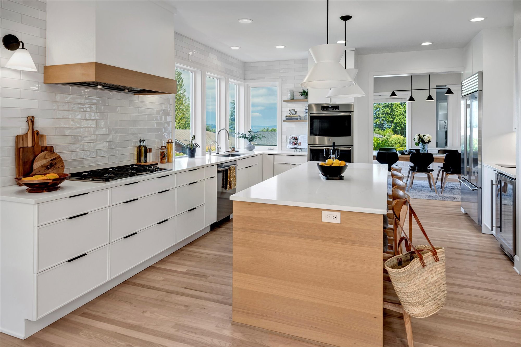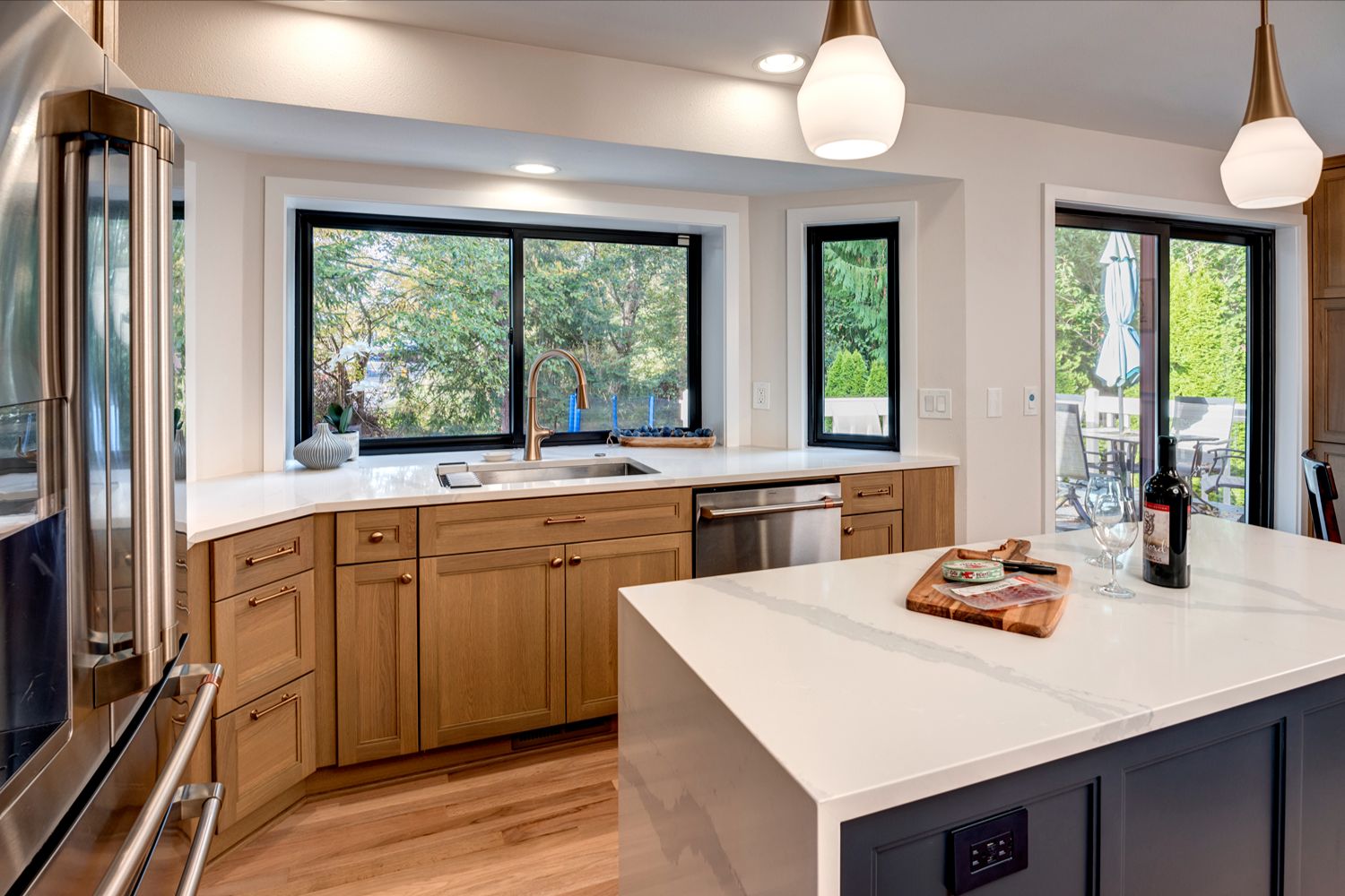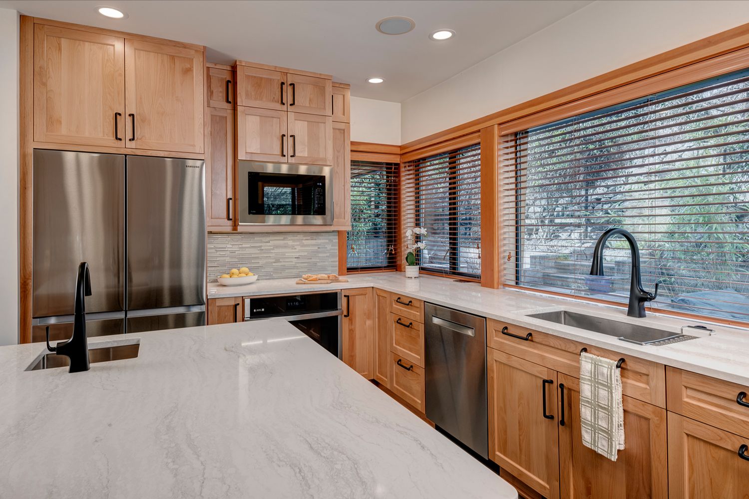 This kitchen offers a seamless blend of organic charm and modern refinement. Natural wood cabinetry brings warmth and texture, beautifully contrasted by sleek black hardware and clean, white quartz countertops. The slate tile flooring adds a grounding element, while the soft gray-blue island introduces a subtle pop of color and additional workspace, complete with bar seating for casual gatherings. Expansive corner windows flood the room with natural light, enhancing the airy feel and connecting the space to the outdoors. A glass mosaic backsplash and stainless steel appliances complete the look, making this kitchen as visually striking as it is highly functional.