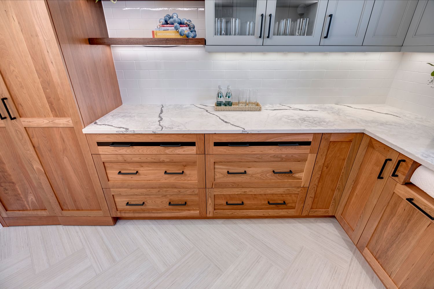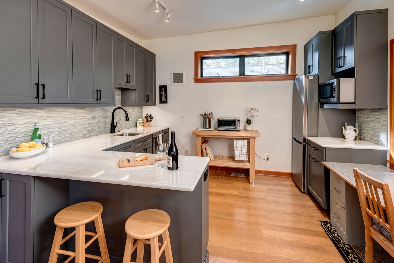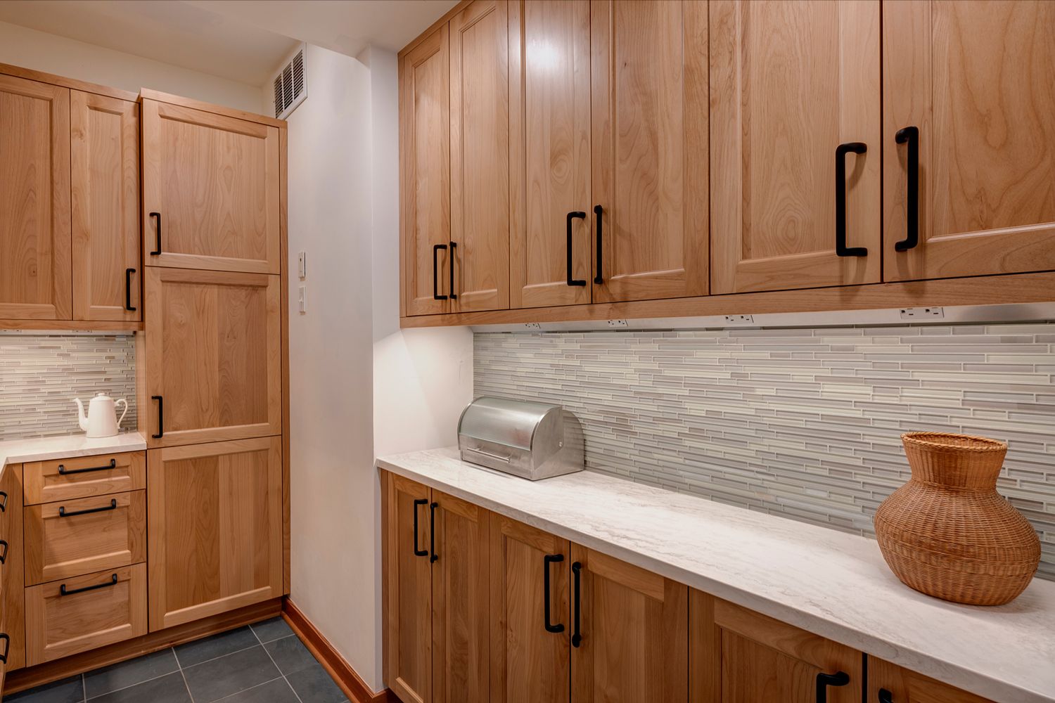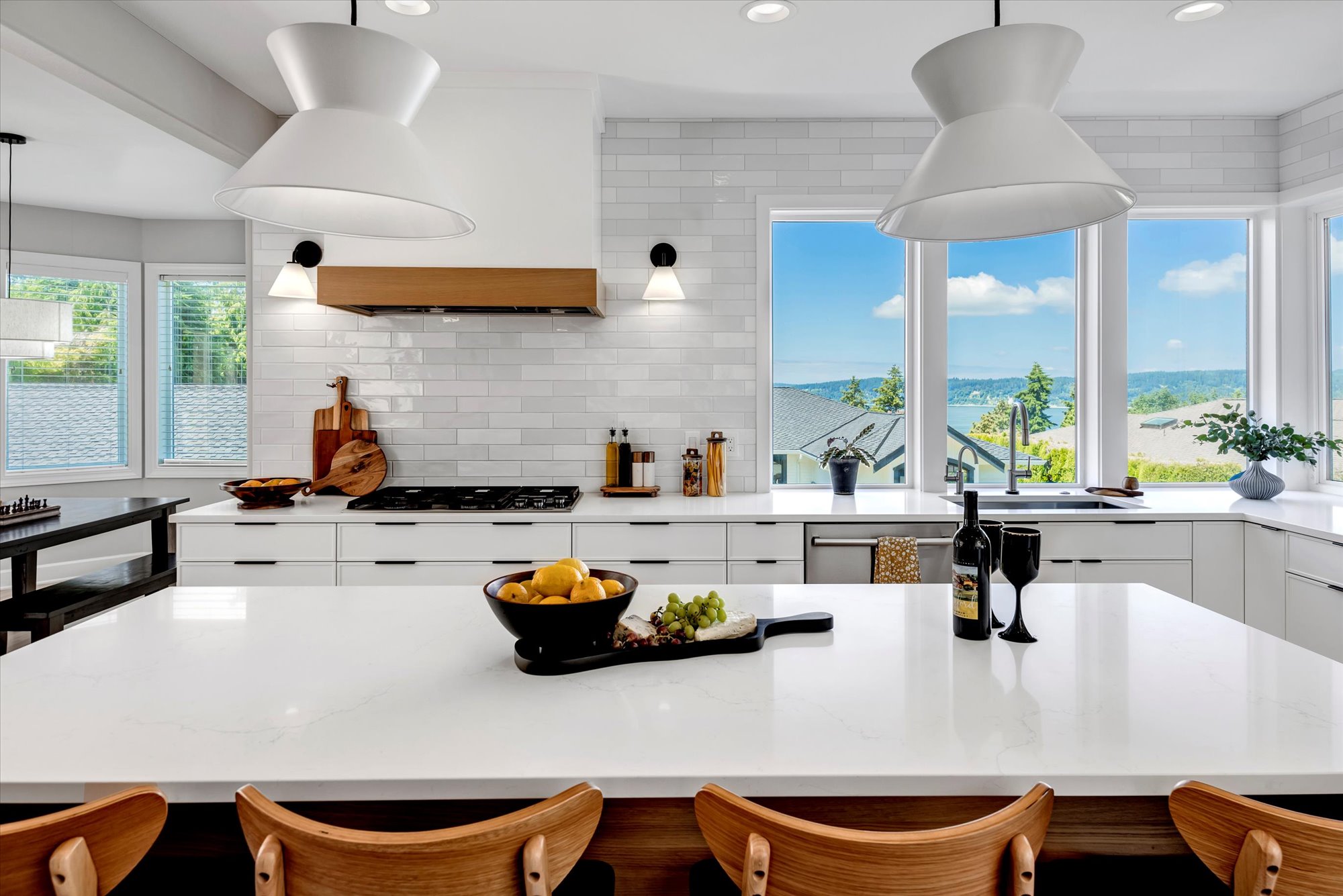 This kitchen offers a seamless blend of organic charm and modern refinement. Natural wood cabinetry brings warmth and texture, beautifully contrasted by sleek black hardware and clean, white quartz countertops. The slate tile flooring adds a grounding element, while the soft gray-blue island introduces a subtle pop of color and additional workspace, complete with bar seating for casual gatherings. Expansive corner windows flood the room with natural light, enhancing the airy feel and connecting the space to the outdoors. A glass mosaic backsplash and stainless steel appliances complete the look, making this kitchen as visually striking as it is highly functional.