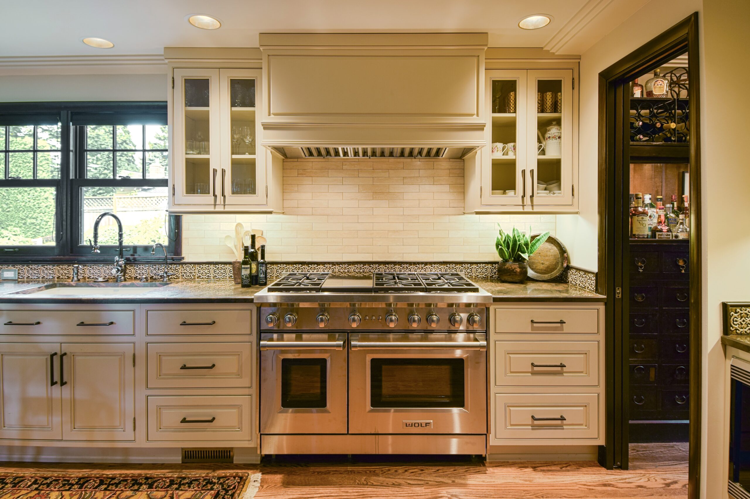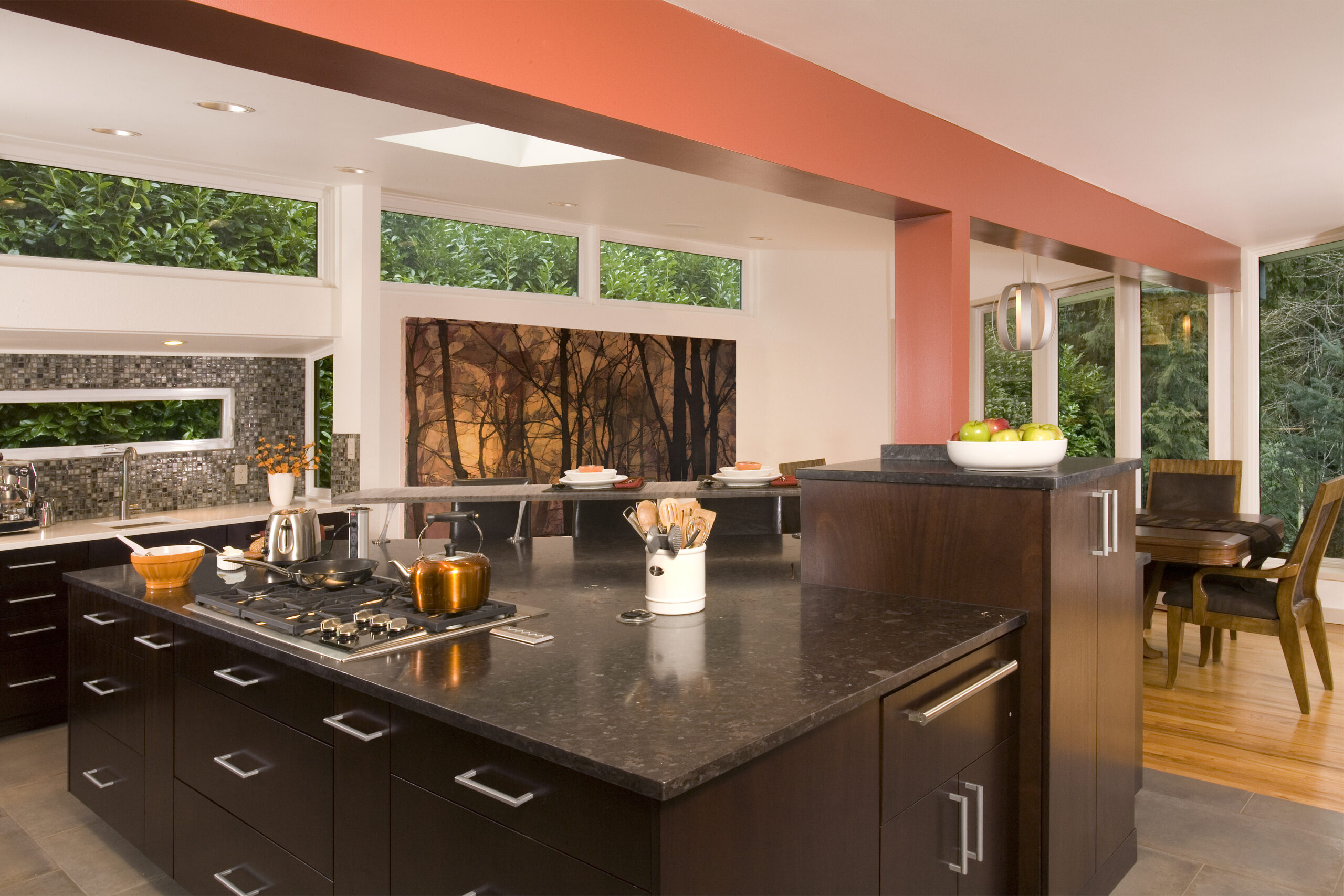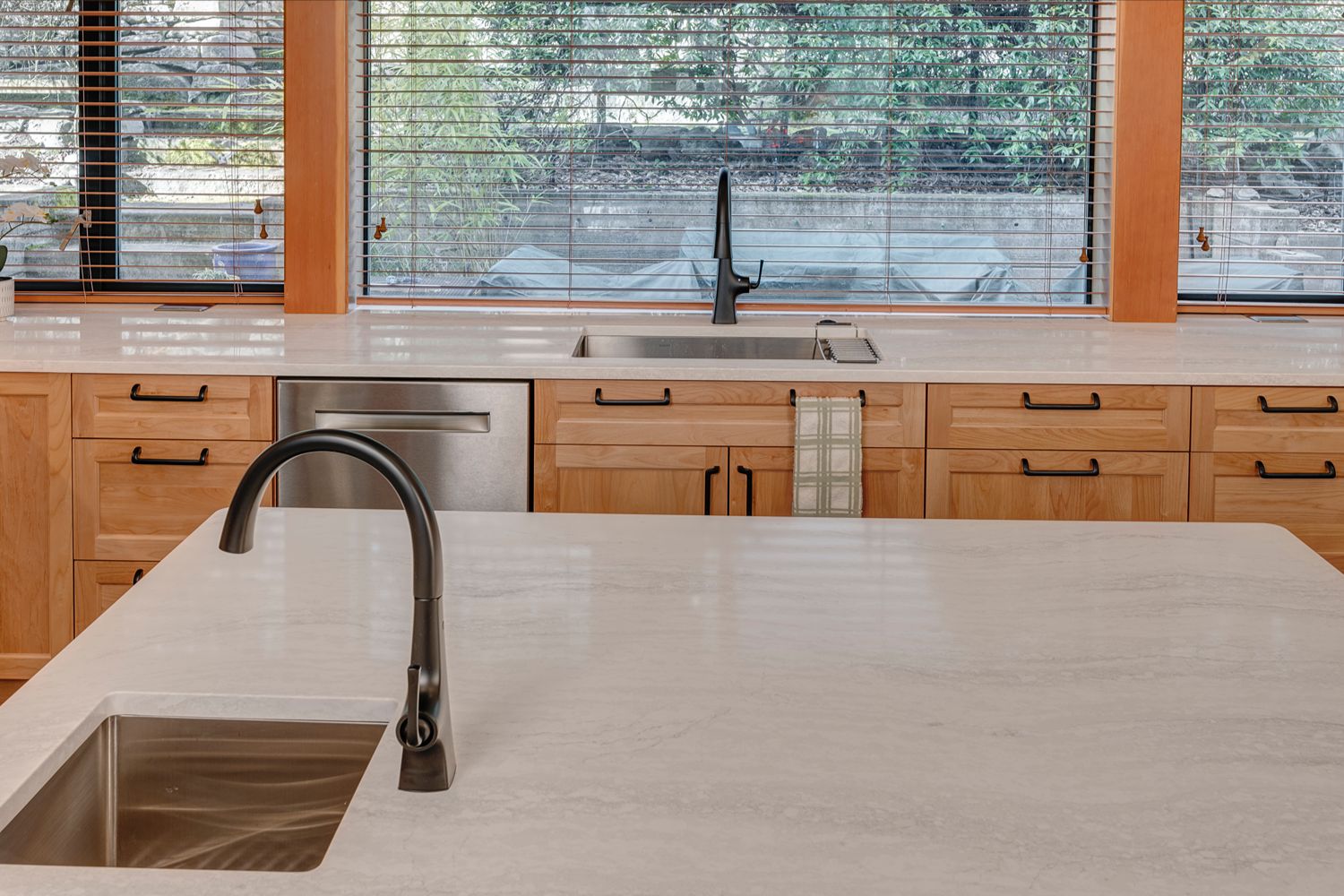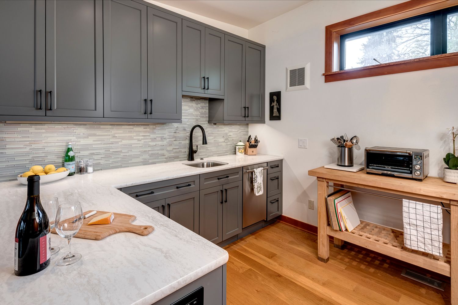 This kitchen offers a seamless blend of organic charm and modern refinement. Natural wood cabinetry brings warmth and texture, beautifully contrasted by sleek black hardware and clean, white quartz countertops. The slate tile flooring adds a grounding element, while the soft gray-blue island introduces a subtle pop of color and additional workspace, complete with bar seating for casual gatherings. Expansive corner windows flood the room with natural light, enhancing the airy feel and connecting the space to the outdoors. A glass mosaic backsplash and stainless steel appliances complete the look, making this kitchen as visually striking as it is highly functional.