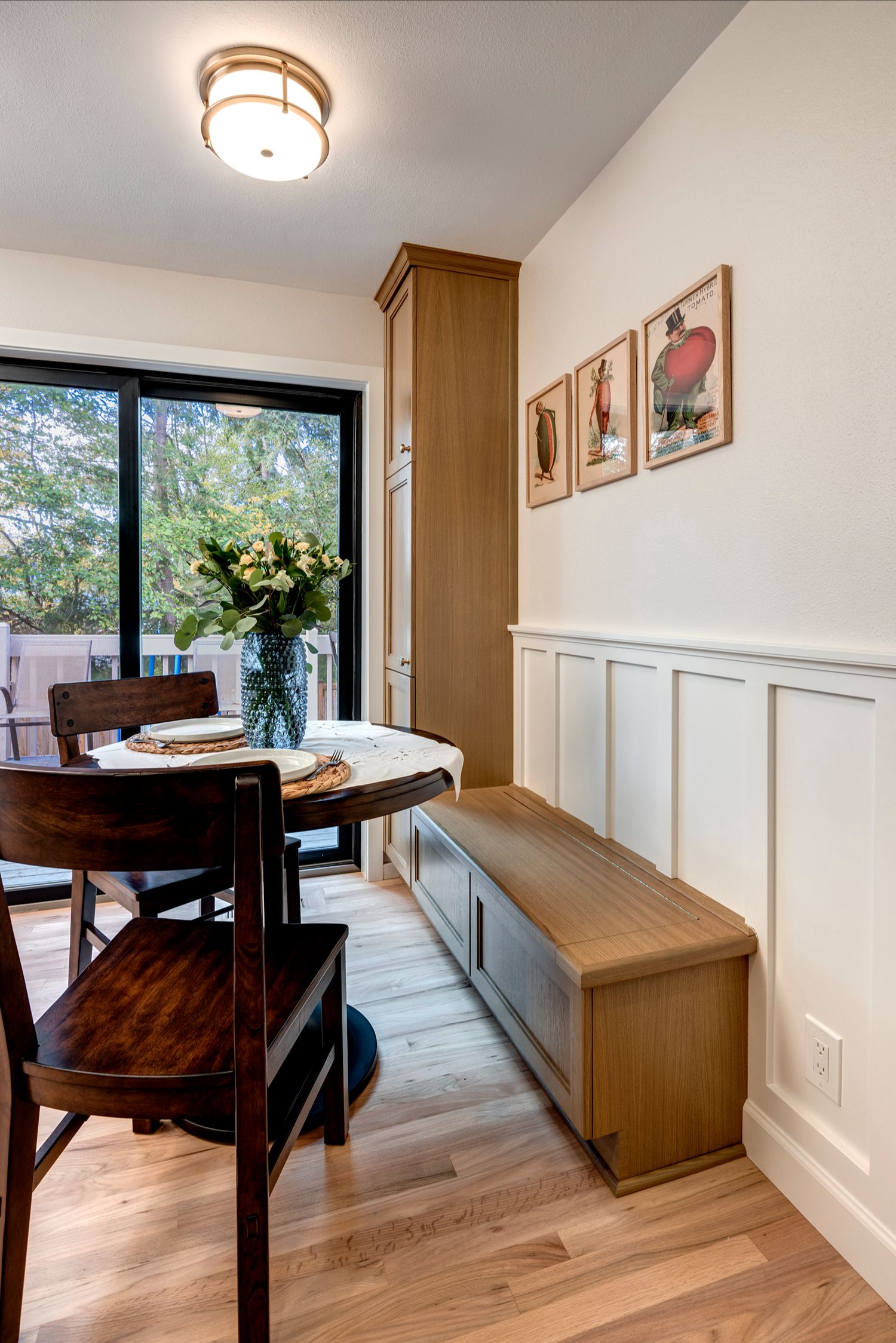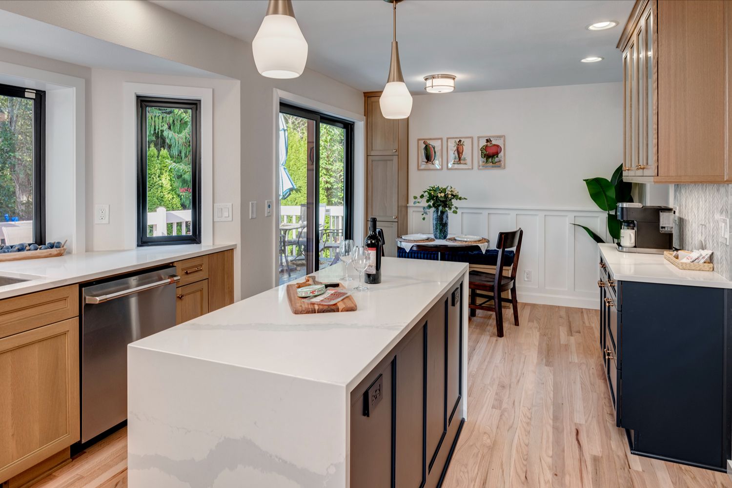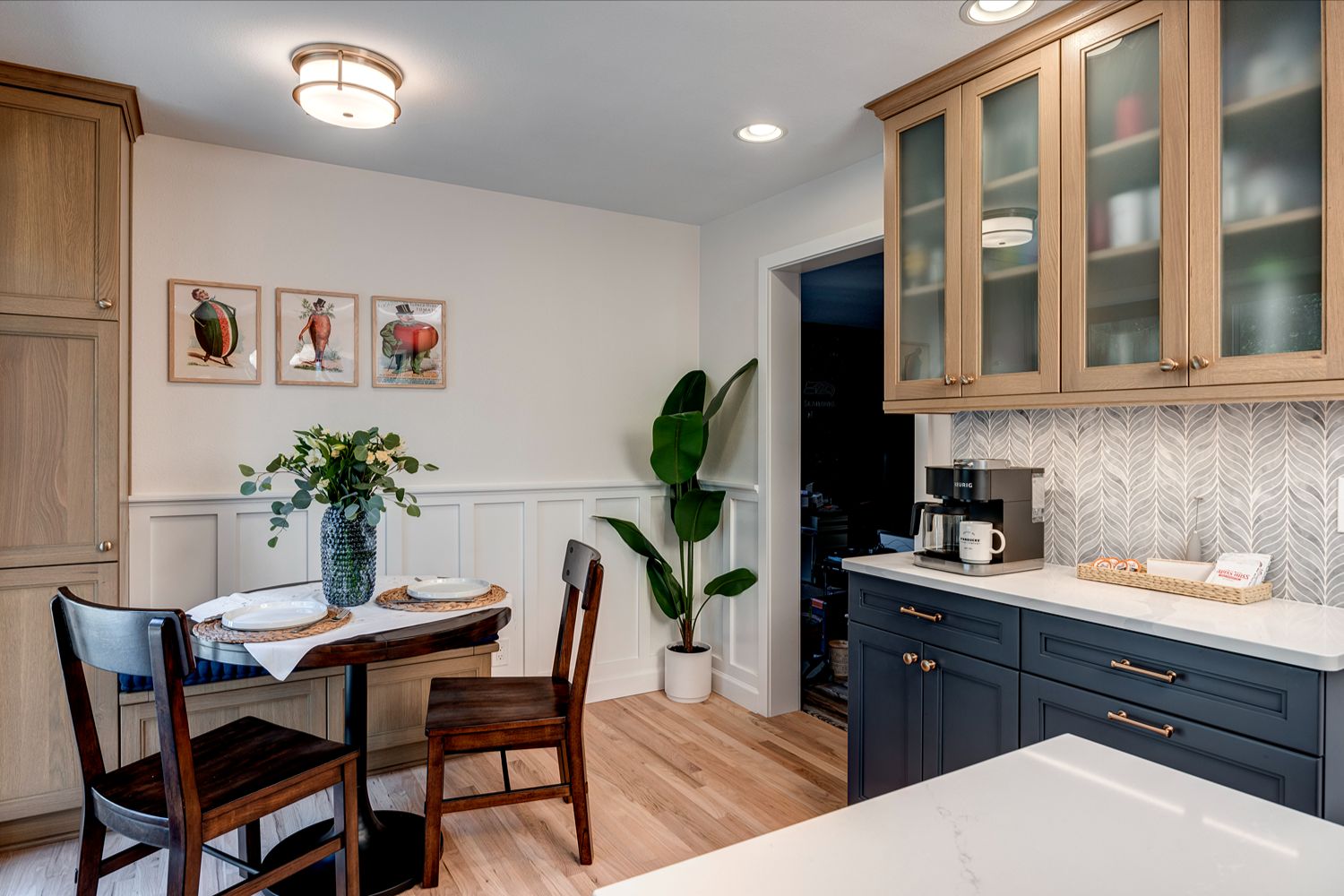 anchors the layout, perfect for both casual meals and entertaining. A sleek coffee station sits beneath elegant frosted-glass upper cabinets and a textured leaf-patterned backsplash, adding function and personality to the space. Nearby, the cozy breakfast nook with classic wainscoting and playful art creates a charming corner for everyday dining. Altogether, this kitchen is both practical and full of character, offering comfort without compromising on