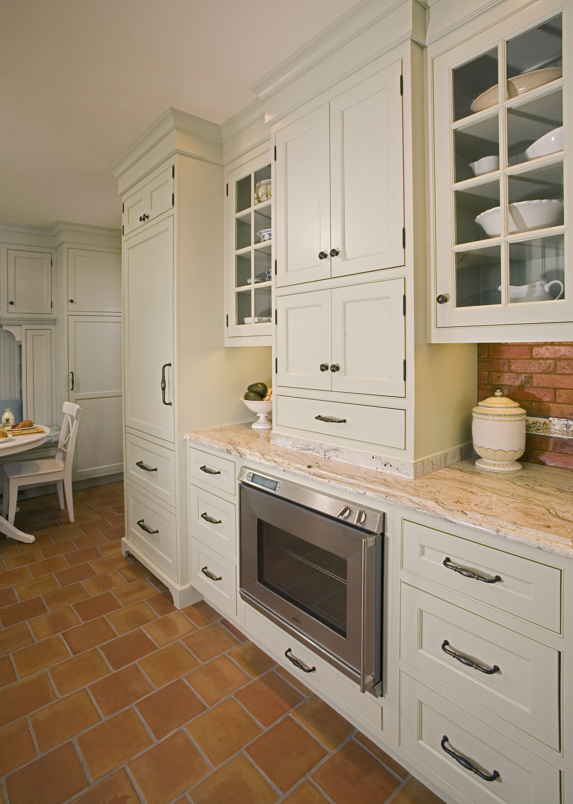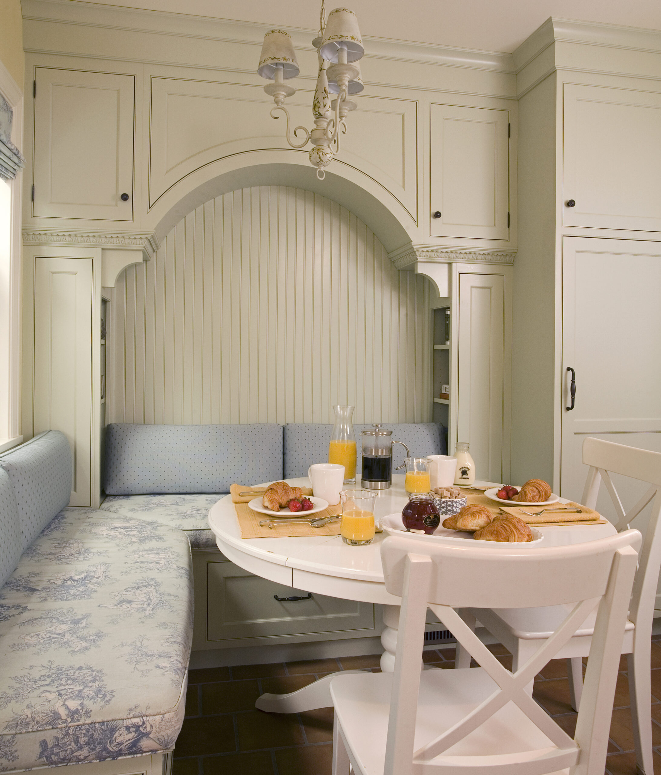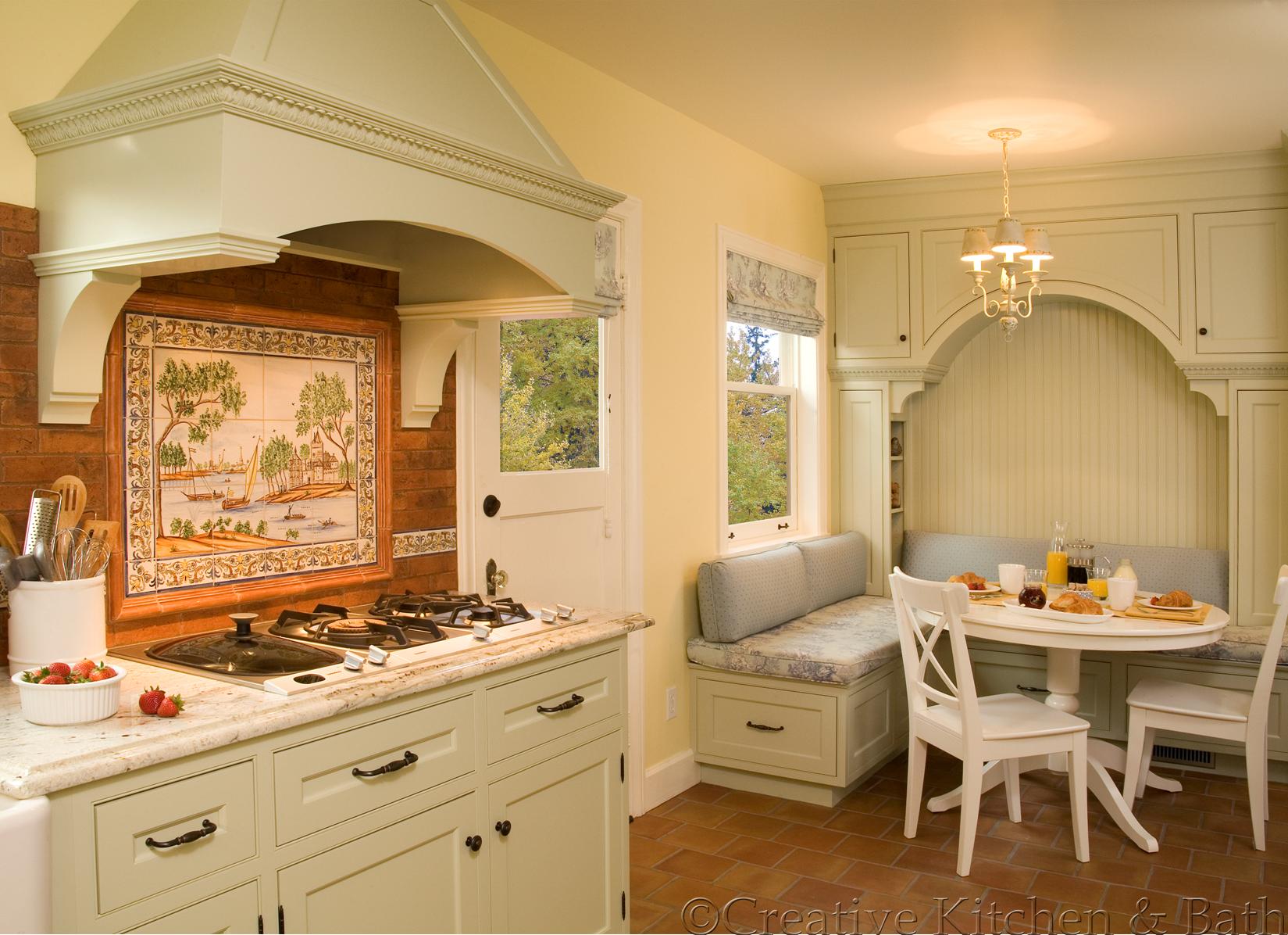 anchors the layout, perfect for both casual meals and entertaining. A sleek coffee station sits beneath elegant frosted-glass upper cabinets and a textured leaf-patterned backsplash, adding function and personality to the space. Nearby, the cozy breakfast nook with classic wainscoting and playful art creates a charming corner for everyday dining. Altogether, this kitchen is both practical and full of character, offering comfort without compromising on