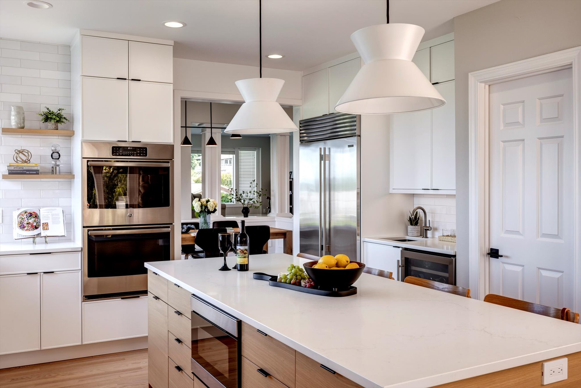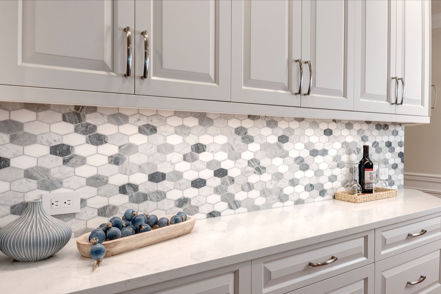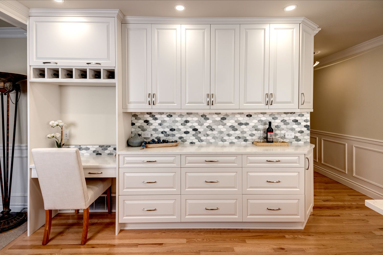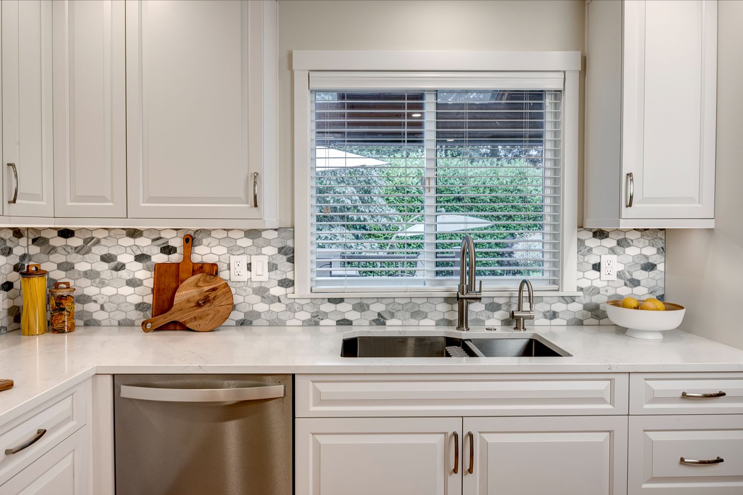 This stunning kitchen blends timeless design with practical features, making it a perfect centerpiece for any home. Crisp white cabinetry, stainless steel appliances, and a stylish hexagon tile backsplash create a clean,
